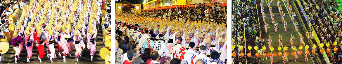 白天的特色是有名的“連(由數十人組成的團體)”在舞台上表演的“選拔(意即精選)阿波舞”(收費)。過了晚上6點以後,街上更加熱鬧,以市中心的公園、可以在近處觀看舞蹈的“演舞場”、遊客可以參與的“舞蹈廣場”、連接不同演舞場的“舞蹈大道”以及町內會(相當於鎮居委會)和商業街主辦的“街角廣場”等各會場為中心,節日氣氛逐步達到高潮,並一直持續到晚上10點半左右。