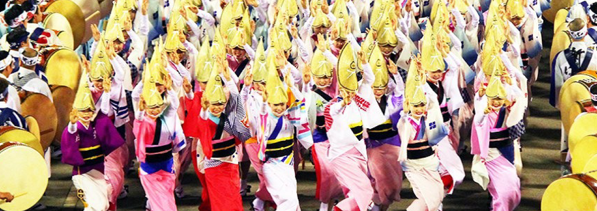 因“舞也阿呆,看也阿呆,同為阿呆,不如一同跳舞”的叫聲(日語稱“囃子”,歌謠中為押韻而用的虛詞,與歌詞的意義無關,只用來打拍子)而為日本全國所熟知的德島阿波舞,是從古代留傳下來的德島盂蘭盆舞(7〜8月期間,為了迎接祖先的魂靈所跳的舞)。據說,德島阿波舞始於1587年,當時德島藩的藩主蜂須賀家政(Hachisuka Iemasa,1558-1638年)為慶祝德島城的建成,在城邑大擺酒宴,喝醉了的市民手舞足蹈跳起來,這就是阿波舞的起源。這裡所說的阿波是德島從前作為諸侯國時的名稱。